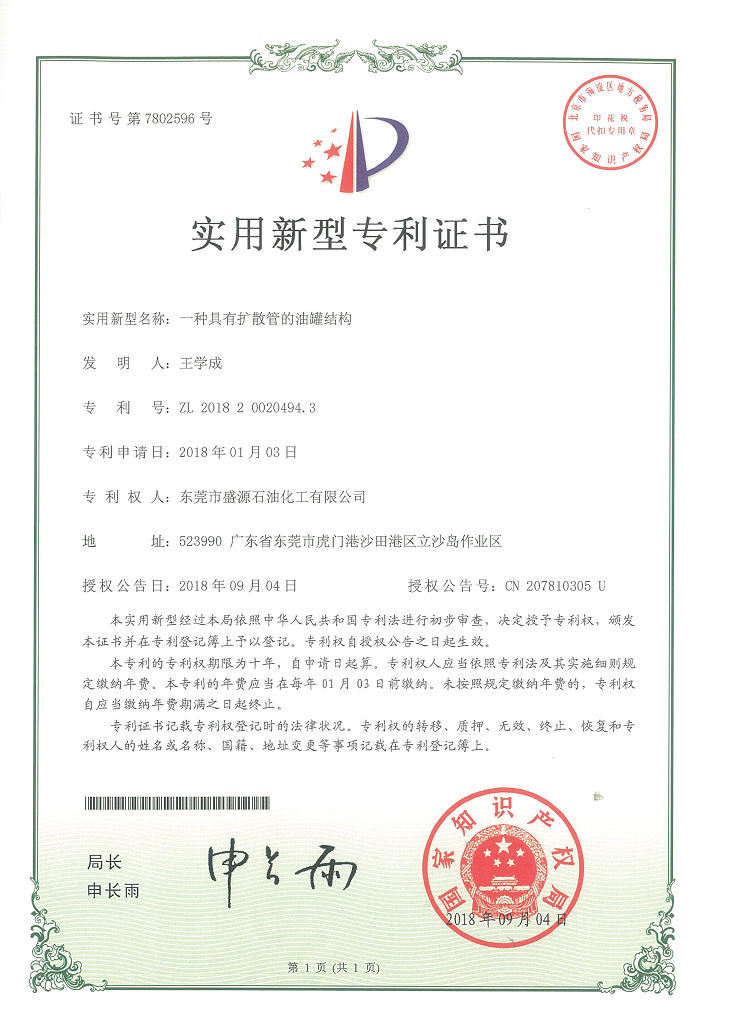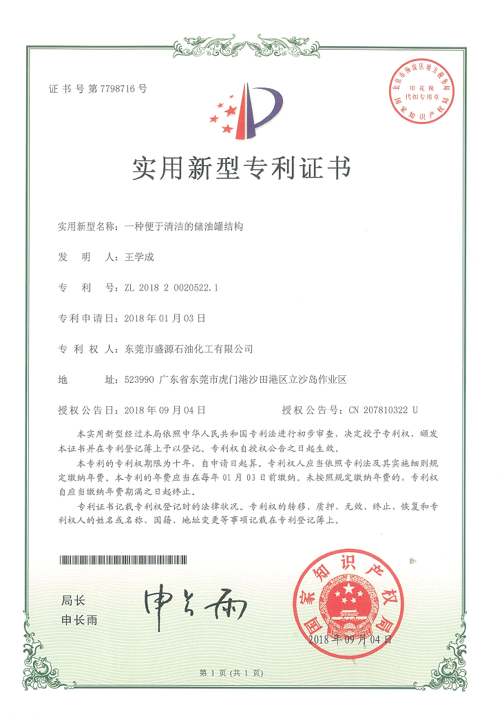 實用新型油罐結構專利證書