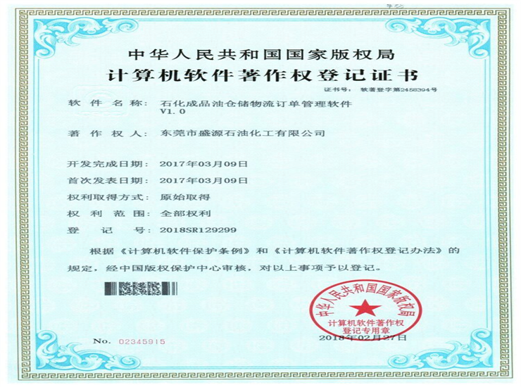 石化倉儲物流訂單管理軟件著作權登記證書