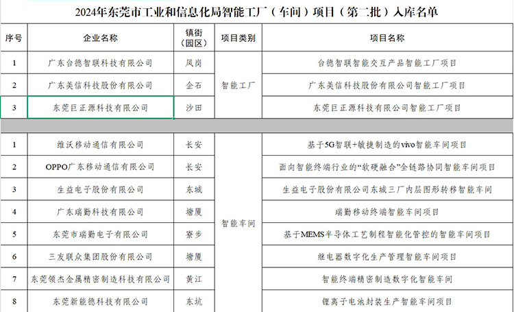 7月1日,東莞市工業(yè)和信息化局公布了2024年東莞市工業(yè)和信息化局智能工廠(車間)項目(第二批)入庫名單。東莞巨正源科技有限公司憑借在數(shù)字化轉(zhuǎn)型和智能制造領(lǐng)域的創(chuàng)新實踐與顯著成效,獲評為“東莞市智能工廠”。