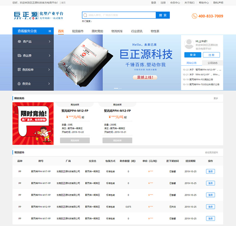 10月21日上午9時,東莞巨正源科技有限公司旗下的產業互聯網平臺——“巨正源電商平臺(www.jzy-e.com)”正式上線。上線當日,巨正源電商平臺共計成交380噸聚丙烯產品,客戶對該平臺的交互界面和功能表示滿意。