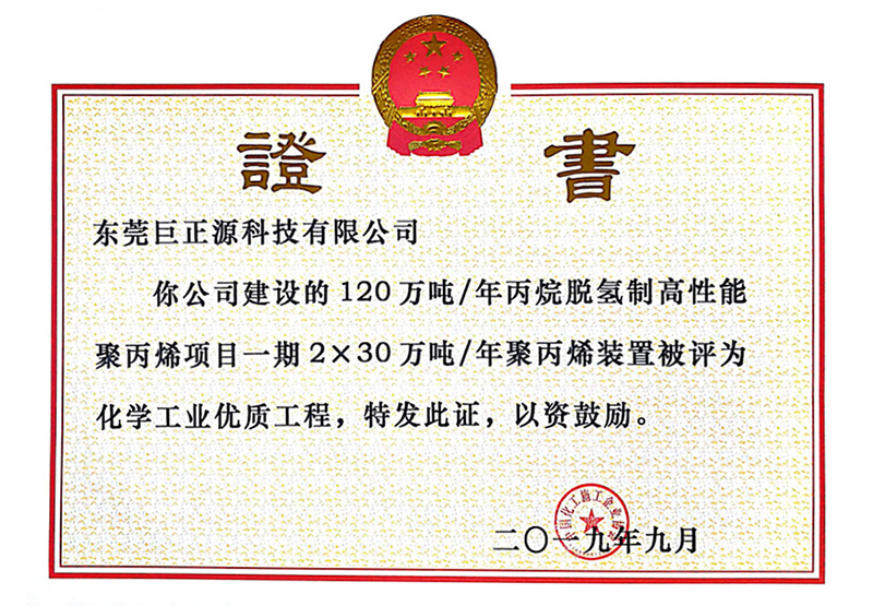 近日,中國(guó)化工施工企業(yè)協(xié)會(huì)公布全面提升工程質(zhì)量創(chuàng)建優(yōu)質(zhì)精品工程活動(dòng)成果。巨正源公司投資建設(shè)的“120萬(wàn)噸/年丙烷脫氫制高性能聚丙烯項(xiàng)目”一期2×30萬(wàn)噸/年聚丙烯裝置獲評(píng)全國(guó)“化學(xué)工業(yè)優(yōu)質(zhì)工程”。