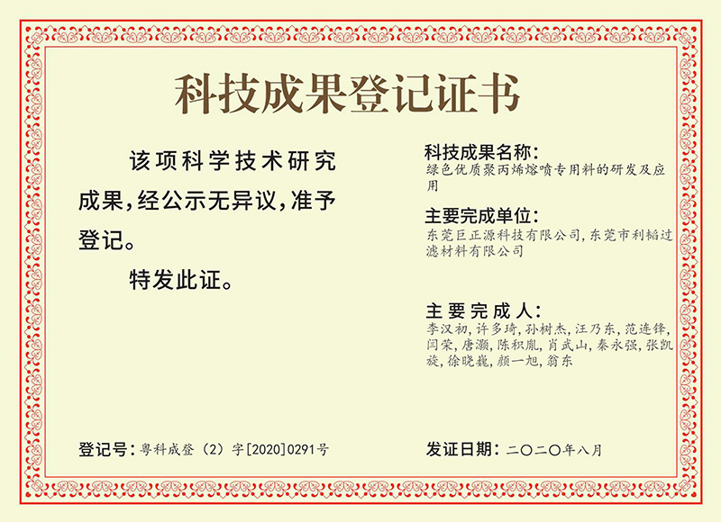 為鞏固提升科研創新水平,4月下旬,巨正源科技公司委托東莞市高新技術產業協會組織專家鑒定委員會對研發項目“綠色優質聚丙烯熔噴專用料的研發及應用”進行科技成果鑒定,經鑒定委員會評審,認為項目成果達到國內領先水平,一致同意通過科技成果鑒定。隨后,巨正源科技公司向登記機構提出成果登記申請,順利通過了登記審查和社會公示,獲得了科技成果登記證書。